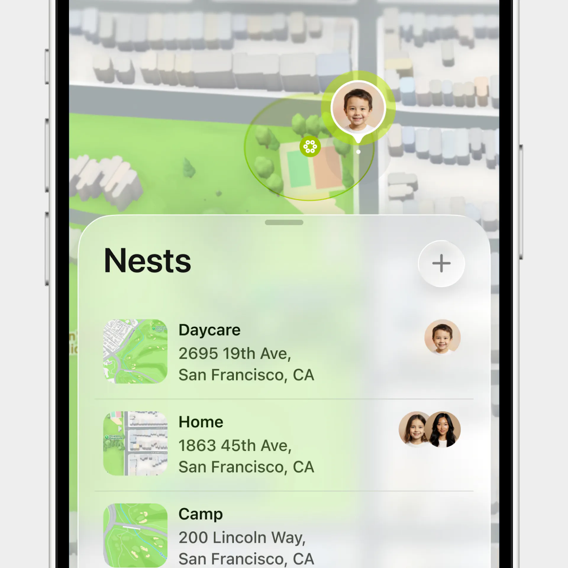 Create Nests at home, school, the park. Get a gentle alert when your child arrives or leaves. No constant need to check—just the right info at the right time.